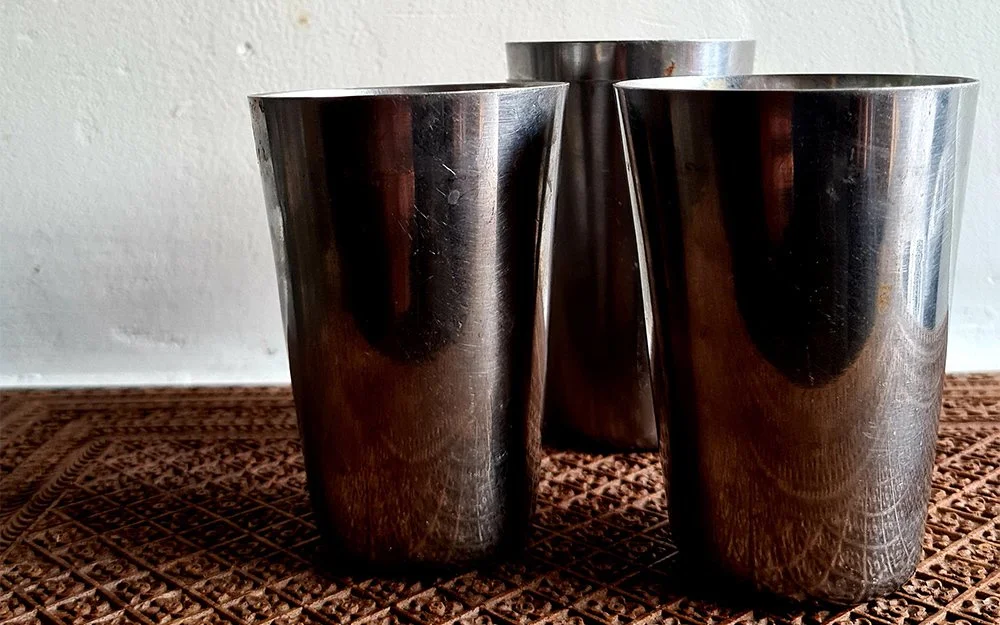 There’s a few things that I would pick but my final one is this steel cup. My mum gave me this. She said if I drink from a plastic cup, I’m gonna get cancer. She sent these from Pakistan, I think. When I touch it, I like the coolness of the touch when the water’s inside it and it reminds me of her.